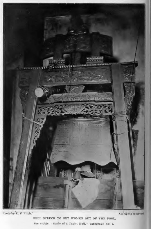 Why women who do their duty in child-bearing should be plunged into such a place is not stated, but it is their misfortune and the Taoists have means to get them out. The hair of the woman must be cut, or some article of apparel such as her shoes secured. The article secured but be brought to a great bell, where money is paid, prayers are said, incense is burned and the bell is struck, to get the woman out of the pool. In the photograph is shown a bell in this Taoist hell with the hair of one woman and the shoes of two women, who died on the first and twenty-first of the 11th lunar month in the year 1913. It is simply a diabolical scheme to get money and to play on the sympathies of the Chinese for women who have failed in facing the responsibilities of motherhood.