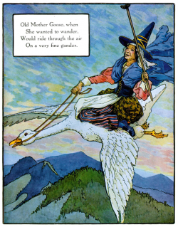 Old Mother Goose was more often than not portrayed as a witch, depicted as a crone wearing a pointed hat and often riding a broomstick rather than a goose. The riding of geese can be found in magical folklore around the world. Mother Goose is also often depicted as a goose rather than an old woman - this once again has connotations with witches and shape-shifting.