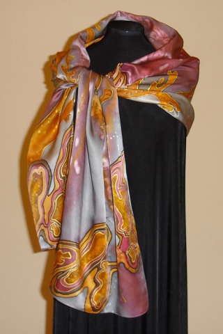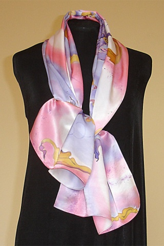 Another fashion faux pas to petites to avoid is the knotting of a scarf draped from the back to tie at the front. Let the ends flow freely instead. The illusion of verticality vanishes, as does the singular effect as soon as you tie the beautifully hand painted and artfully designed silk scarf or shawl in this fashion.