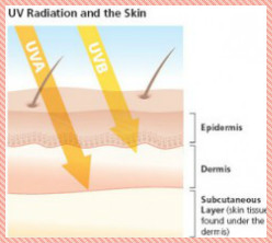 The sun produces both visible rays (which you see in the colors of the rainbow) and invisible ones, some of which are ultraviolet (UV). There are two types of UV rays: UVA rays trigger wrinkles and premature aging by penetrating the deeper dermal layer of the skin and damaging the collagen and elastic fibers, the support structures of the skin. UVB rays are the chief culprits in sunburns. They are absorbed by the epidermal layer and deplete part of the body’s natural cell-protection system, damaging cells (which causes a sunburn) and their DNA.