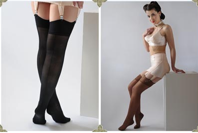 What Katie Did also dedicates an entire section of their inventory to stockings popularized by the film stars of the 1940's and 1950's. Pictured here are 60 denier stretch seamed stockings. To give you a frame of reference the seamed stockings in the first portion of this article are only 15 denier. 60 denier stockings are not only hard wearing, but they also tend to be very warm, perfect for those coming winter nights. You'll also see some rayon seamed stockings here, a type of stocking which was very popular during war time when silk was difficult to come by due to the fact that it had been requisitioned for parachutes and whatnot. Rayon was the substitute fabric of choice, which makes these stockings perfect for the man who really wants to feel that he has stepped back in time.