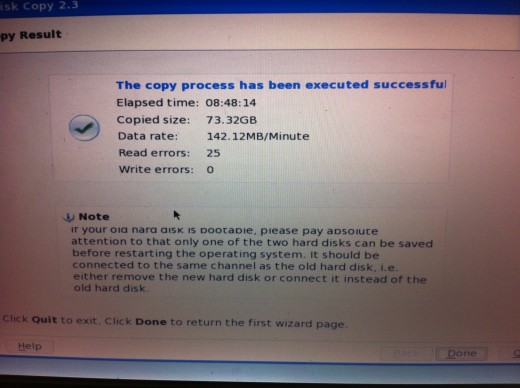 Round three! Later that evening I decided that I would setup my Dad;s laptop and make it do all the work. I plugged in both drives, popped in the bootable CD and decided to just let the program run its course. The next morning, I awoke to a message stating that I had bad sectors and the software inquired what I wanted to do with them. Ignore or quit? Well the entire purpose of running the software in the first place was to replace a failing drive, so I ignored them. Here's the kicker though, it gave this message about 6 hours and 15 minutes into the process. Once I accepted the ignore option, it was only another half hour and it was done. I wish I had been more patient with round two, as it would have saved me a lot of trouble. I also discovered through the software manufacturer's forum, that during the wizard I should have just clicked "Quite Mode" when copying the drive. It would have automatically ignored any disk errors that it had found. Apparently the drive wasn't too bad off and only had a few bad sectors. A side note though, that the more bad sectors that you have, the longer the cloning process will take. There was one question posted online regarding a copy time of over 53 hours! Many users of the software were complaining about the time it takes to clone a drive, but unless you have drive error it's smooth sailing.