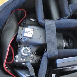 This picture shows the backpack holding my Canon EOS Rebel T3i and the following accessories: EFS 55-250mm Lens, ring flash, fliters, wide angle lens, 2.0x telephoto lens, and lens hood.