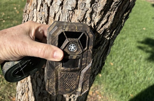 So with the battery charged and the antenna screwed on and an SD card inserted (32GB included with options of up to 256GB), and the app ready to go by having added the cam to it (kicking the cam into gear using the included ejection pin). A specialized strap goes around the camera and around a tree (the reason why the cam is camo colored) about 3 1/2 feet to almost 5 feet tall and be aware that there aren’t branches or leaves or anything that might set off the sensors. Putting up the cam is not that complicated, although having a small stepladder makes it easier for those of normal height (meaning under 6 1/2 feet). You can put it up and then change it at a later time fairly easy, with the same said for the solar panel as it also uses a strap (the panel itself going on an included tripod so it can angled towards the sun).