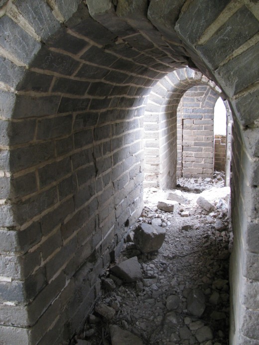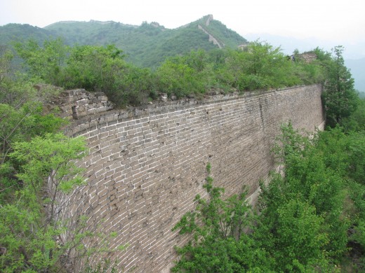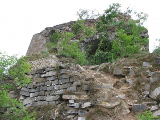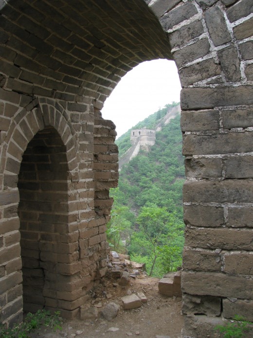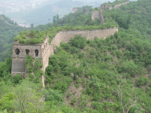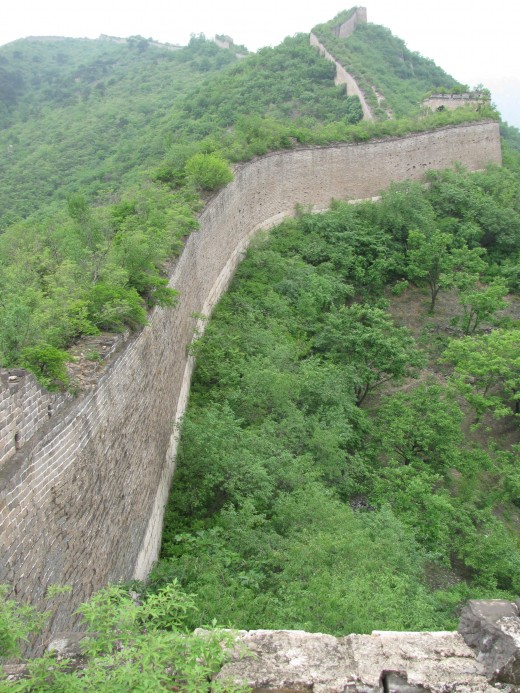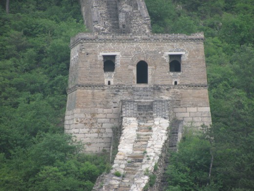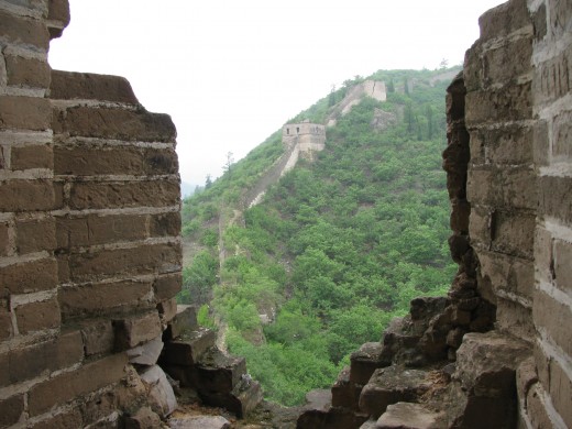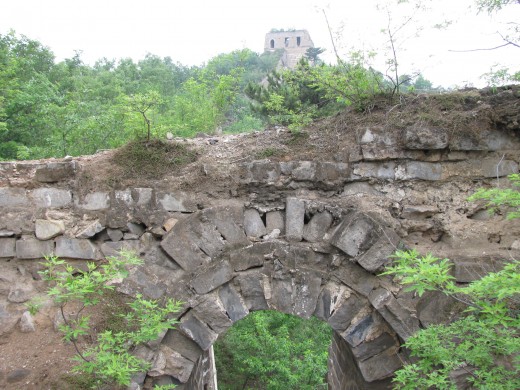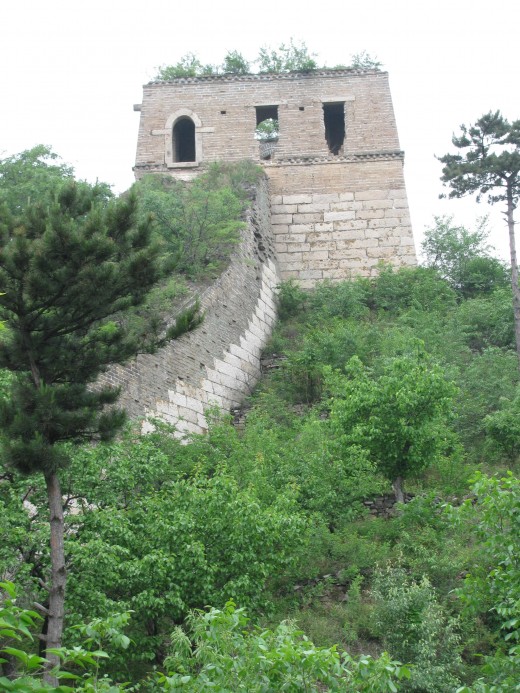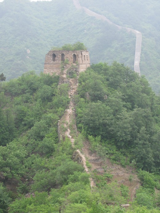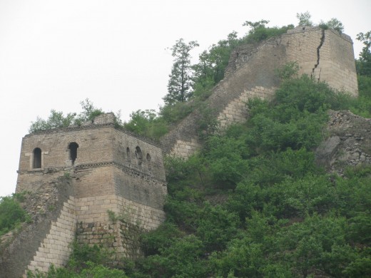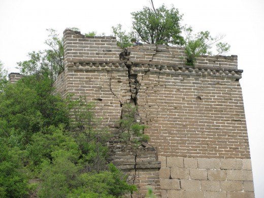 Once past the narrow crossing, it is still a steep climb on up the Great Wall as it follows the natural mountain ridge, but the views are spectacular. Shrubs and other vegetative growth also impede climbing, but there is a reasonably well-worn path to follow if one is observant enough. One of the big guard towers along this route has a huge crack running vertically the full length of the tower, which makes one wonder exactly how much longer this guard tower will last without some type of preservation effort. Sadly, throughout the length of the Great Wall there seems to be no middle ground with preservation - it is either allowed to completely crumble away or it is fully rebuilt, as was done at Badaling and other sections, and as is currently (2010-2012) being done at the incredibly beautiful section of the Great Wall at Simatai.