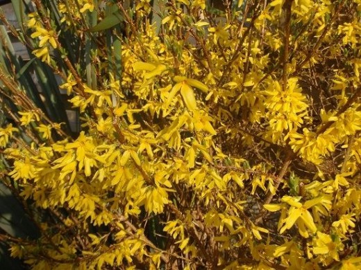 This bushy forsythia bush stands against our back garden fence. In late March, as if to herald the first day of Spring, it bursts forth in a blaze of yellow adding a ray of sunshine to a miserable, rainy day and we can get a lot of those here in Wales! Forsythias are prone to suckers, tall straight branches that grow vertically from the base, be sure to trim these as they will cause the yellow flowers to be reduced in number.