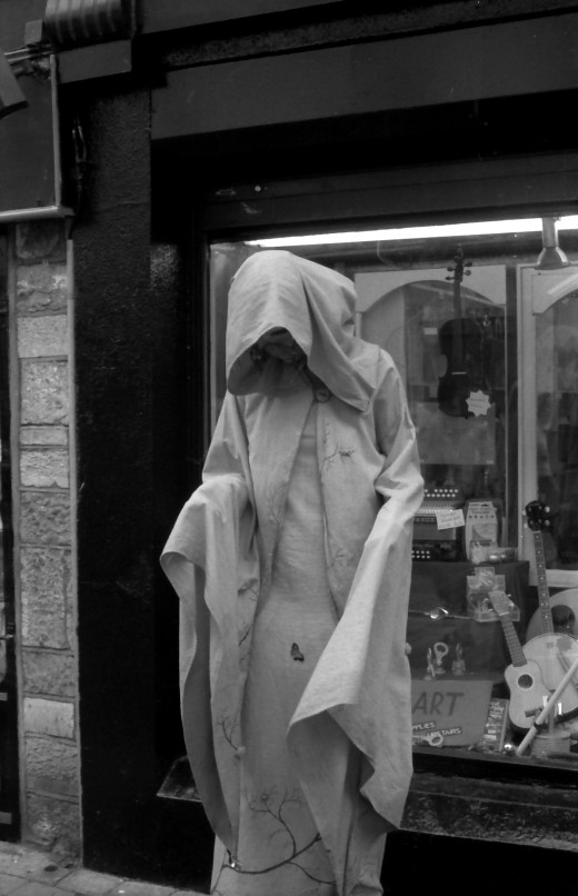 In Galway, street performers can range from playing music, staying still in a mysterious manner, to mischievously interacting with you. They want your attention. They have this element of mischief similar to creatures found in Irish mythology. Italian performance artists just stand there, only moving when you leave money. As seen in the photo below, the masked performer reminds the city of the Egyptian Influence on Rome. Performance as an act of defiance. The performer is silent but certain, as regal as a statue.